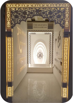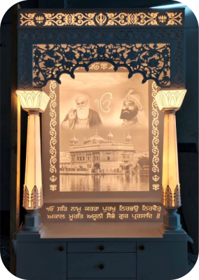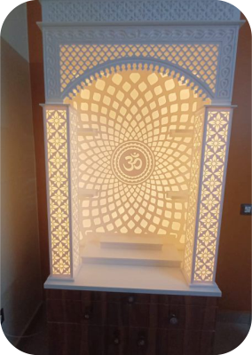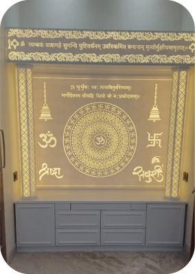 This luxury Corian mandir comes with a stylish backlit panel that adds a divine glow to your pooja space. The smooth finish and intricate carvings give it a premium look. Made from termite-proof and long-lasting material, it is a perfect choice for modern homes.