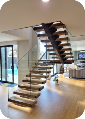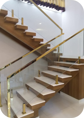 This staircase features premium glass railings that create a spacious and luxurious feel. Its modern design allows light to flow freely, making your interiors look brighter and more open. Bring warmth and timeless beauty to your space with a wooden staircase. Crafted with high-quality wood, it offers durability along with a rich and elegant appearance suitable for both modern and traditional interiors.
