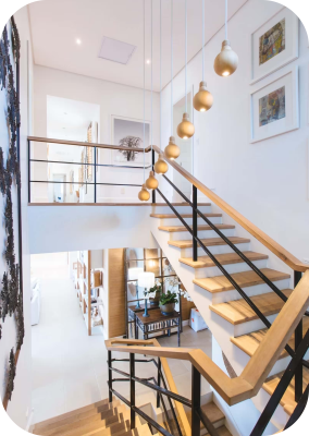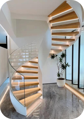 This staircase features premium glass railings that create a spacious and luxurious feel. Its modern design allows light to flow freely, making your interiors look brighter and more open. Bring warmth and timeless beauty to your space with a wooden staircase. Crafted with high-quality wood, it offers durability along with a rich and elegant appearance suitable for both modern and traditional interiors.